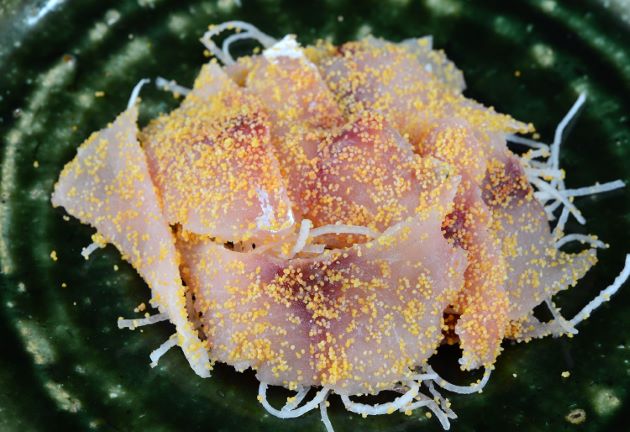 ニゴロブナのじょき 琵琶湖に浮かぶ、沖島で作られているものだ。ニゴロブナは「子つけ」と呼ばれる刺身に子(卵巣をゆでてほぐしたもの)をまぶしつけたもの、洗いなどは見かけるが、この沖島のものは三枚に下ろして、皮ごと切りつけている。いうなれば背ごしである。