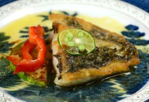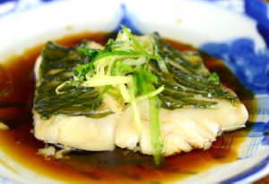 ニシキブダイの蒸し魚(清蒸) 雌の小さなものは丸ごと、大きなものは頭部や切り身にして作る。水洗いして三枚に下ろし、ここでは切り身にする。水分をよくきり、皿に盛って10〜15分蒸し上げる。たれ(醤油・魚醬・砂糖・紹興酒・八角の欠片を合わせて一煮立ちさせたもの。中国・台湾の甘い醤油でもいい)をかけて香りのある野菜を乗せて熱した油をかける。クリックで閉じます![]()