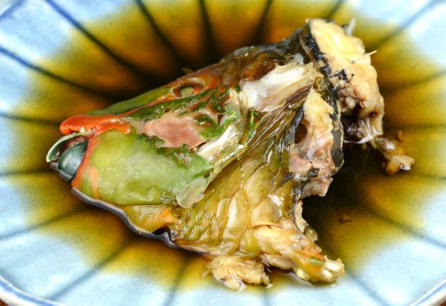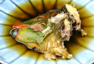 ニシキブダイの兜煮(煮つけ) 水洗いして頭部を梨子割りにする。湯通しして冷水に落として残った鱗やぬめりを流す。水分をよくきり酒・みりん・醤油・水を煮立てた中で煮る。味つけは好みのもので。厚みのある皮が非常に味わい深い。身も少し硬く締まって美味。クリックで閉じます![]()