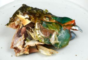 ニシキブダイの兜焼き(塩焼き) 水洗いして頭部を梨子割りにする。汚れなどをていねいに取り、水分を拭き取り振り塩をする。1時間以上寝かせてじっくり焼き上げる。寝かせる時間は1日程度と長い方がうまい。焼き上げると皮目から実にいい香がする。皮も身も非常にうま味豊かでおいしい。クリックで閉じます![]()