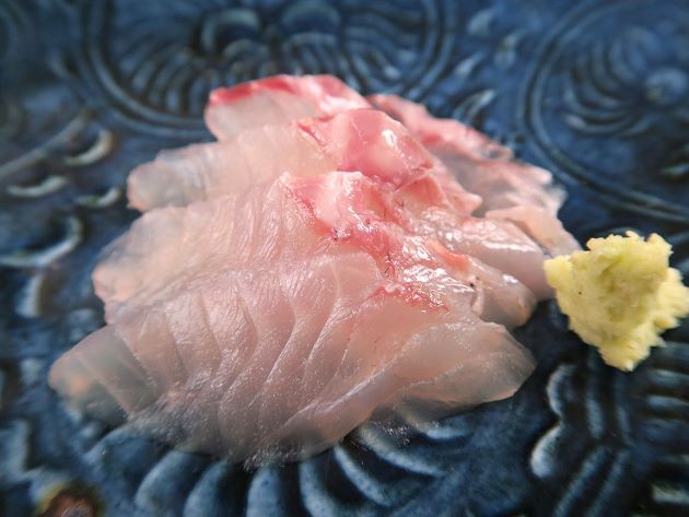 ![ニセクロホシフエダイの皮霜造り]()