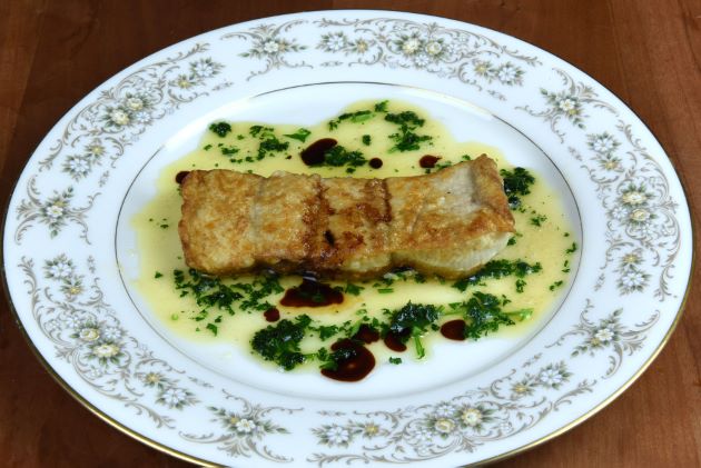 ニタリのムニエル ムニエルもサメ類の定番料理のひとつだ。ネズミザメ(もうか)のように硬く締まらず、ふんわり仕上がるのがいい。筋肉自体にうま味はないものの、上品な仕上がりでバターと相性がいい。