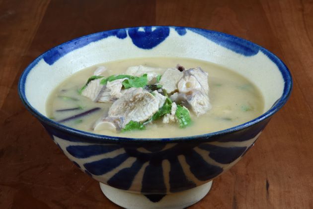 ニタリのみそ汁 中骨や鰭周りなどを集めて置く。湯通しして冷水に落として鱗、ぬめりを流す。よく水分を切って水から煮出してみそをとく。ここでは青みにボタンボウフウ(長命草)を使ったがなんでもいい。肝を加えると濃厚な味になる。