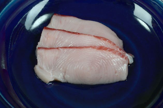 ニタリの刺身 やや赤みがかった白濁した白身で、刺身はとても淡泊。さしみしょうゆやしょうが、わさびなどで食べるとまずくはないが味わいというか個性に欠けるところがある。酢みそが合いそうだ。