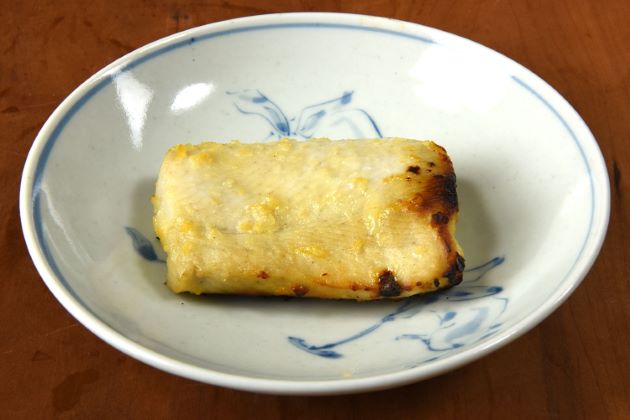 ニタリのみそ漬け(西京漬け) ここでは京都の白みそを使った。白みそ、みりん、酒、砂糖を合わせて地を作る。これに振り塩をして1時間以上置き、水分を拭き取った切り身を漬け込む。1日以上漬け込んだものをじっくりと焦がさないように焼き上げる。少し硬く締まるがとても上品な味わいになる。