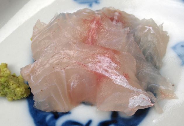 ノコギリダイの刺身 関東ではめったに刺身で食べられる固体は来ない。少ない個体数しか食べてはいない。水洗いして皮を引き、刺身状に切る。食感こそ強くないものの、ほんのり呈味成分からくる甘味があり、柔らかく美味である。