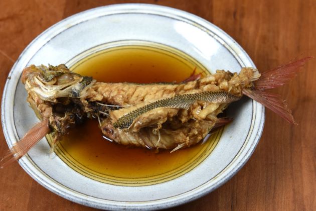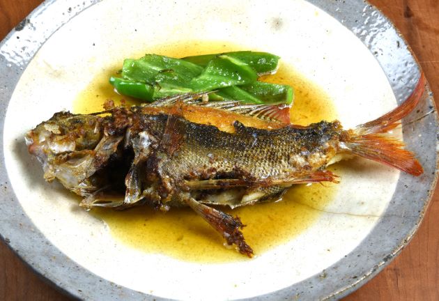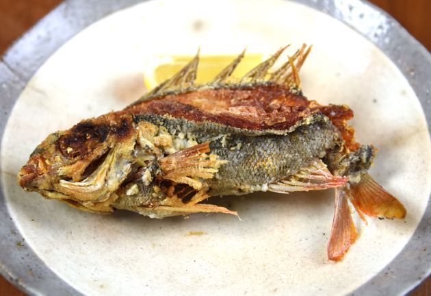 ノコギリダイの唐揚げ 素揚げにするべきか、唐揚げにするべきか悩んだが、皮が柔らかいので、唐揚げにしてみた。水洗いして水分をよくきり、片栗粉をまぶしてじっくりと二度揚げする。骨まで食べ尽くすことができ、身の甘味とうま味もある美味。クリックで閉じます![]()