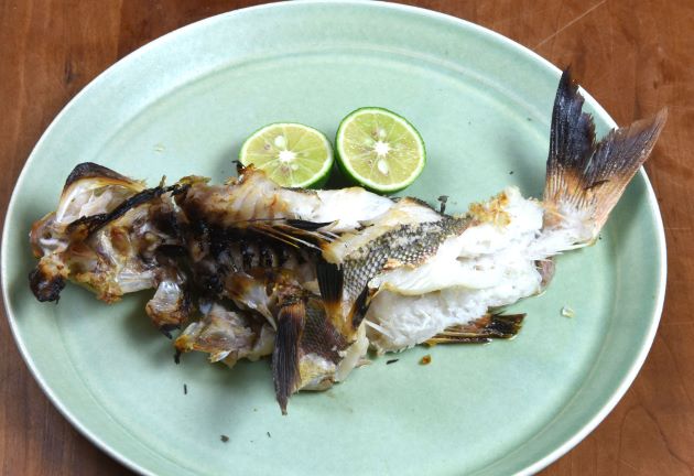ノコギリダイのバター焼き 水洗いして塩コショウして多めの油でソテーする。火が通ったらマーガリン(バターでも)で風味づけする。皮目は香ばしく、身はほどよく締まり、うま味がある。しょうゆをたらすとご飯に合う。沖縄県では一般的なおかずである。クリックで閉じます![]()