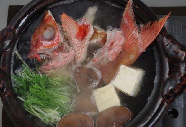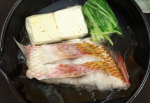 ハチジョウアカムツのちり鍋 上品な白身でいながら、脂が豊かで、旨みがあり、汁にしてよいだしが出る。もっとも単純な昆布だしに酒・塩の鍋に最適である。水洗いして適当に切る。大型ならアラでもいい。これを昆布だしに酒・塩のだしで煮ながら食べる。