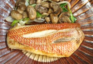 ハチジョウアカムツのバター焼き 魚をソテーしてマーガリン(バター)で風味づけしたもので、これも沖縄の郷土料理のひとつである。水洗いして三枚に下ろす。骨つきでもいいし、腹骨や血合い骨を取ってもいい。塩コショウして多めの油で香ばしくソテーし、最後にバターで風味づけする。醤油を落とすとご飯に合う。