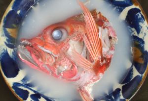 ハチジョウアカムツのまーす煮 大型の個体の頭部を塩煮にしたもの。頭部はていねいに鱗を流す。鍋にやや強めの塩水を煮立てた中で強火のまま煮る。水分がへってきたら出来上がりである。豆腐などを一緒に煮るととてもおいしい。