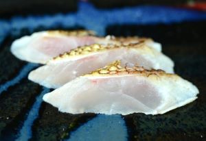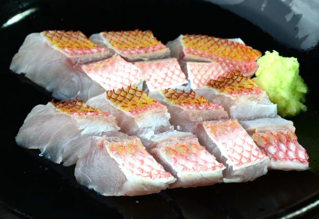 ハチジョウアカムツの霜皮造り(小型) 大型は皮に厚みがあり、湯をかけるだけではまだ硬いが、小型なら柔らかくなる。あぶったときよりも皮本来の味が楽しめる。水洗いして三枚に下ろして腹骨と血合い骨を取る。皮目に湯をかけて氷水に落として刺身状に切る。