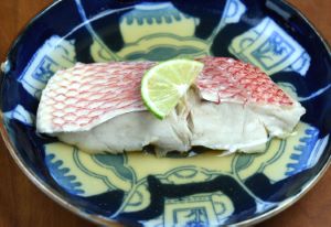 ハチジョウアカムツの酒蒸 一皿一人前の料理は小粋で、日本酒にとても合う。水洗いして三枚に下ろして切り身にする。振り塩をして少し置き、表面に出て来た水分を拭き取る。皿にもどした昆布をしき、魚の切り身、豆腐などをのせて酒をふって蒸し上げる。