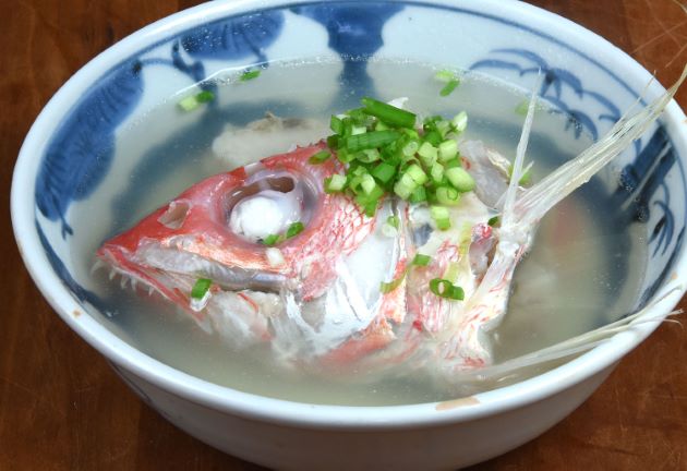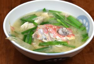 ハチジョウアカムツのみそ汁 「魚汁」は沖縄県の郷土料理で、魚のみそ汁である。汁というよりも主菜に近い。あらなどを集めて置く。湯通しして冷水に落として残ったぬめりや鱗を流す。水分をよくきり水から煮出してみそを溶く。とてもご飯に合う。食べすぎに注意だ。
