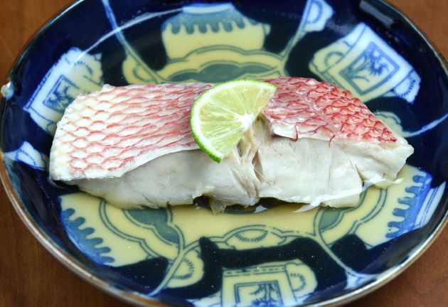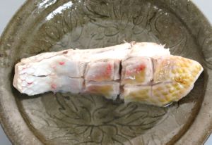 ハチジョウアカムツのあっさり煮(冷たい煮つけ) 煮つけは煮つけだが、煮る時間は最小限にして冷ましながら味を含ませている。冷やして食べた方がうまい。水洗いして切り身にする。湯通しして冷水に落として表面のぬめりや鱗を流す。水分をよくきり、酒・みりん・醤油・昆布だしの中で煮る。数分煮たら火を止めて冷ます。さらに冷蔵庫で冷たく冷やす。