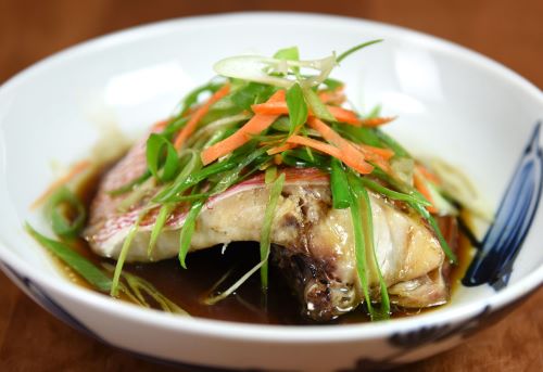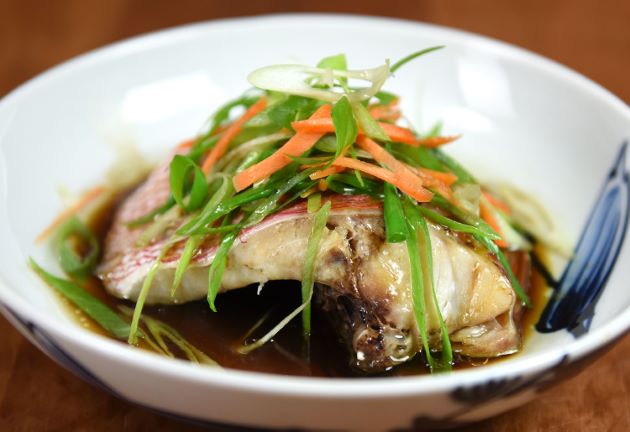 ハチジョウアカムツの蒸し魚(清蒸) ここでは同の部分を蒸したが頭部でもどこでもいい。水洗いして三枚に下ろして切り身に。水分をよくきり、皿に長ネギなどを敷き、切り身を乗せて蒸す。蒸し上がったら醤油・魚醬・砂糖・老酒を合わせて一煮立ちしたものをかける。香りのあるねぎなどを乗せて、煙が出るくらいに熱した油をかける。