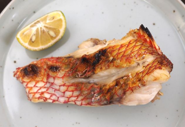 ハチジョウアカムツの塩焼き 焼いても実に味わい深い。脂があるので硬く締まらないのもいい。水洗いして切り身にする。振り塩をして1時間程度置き、じっくりと焼き上げる。焼くと皮の香りが立ち、身はふんわりとして口の中に入れると適度にほぐれて甘味がある。