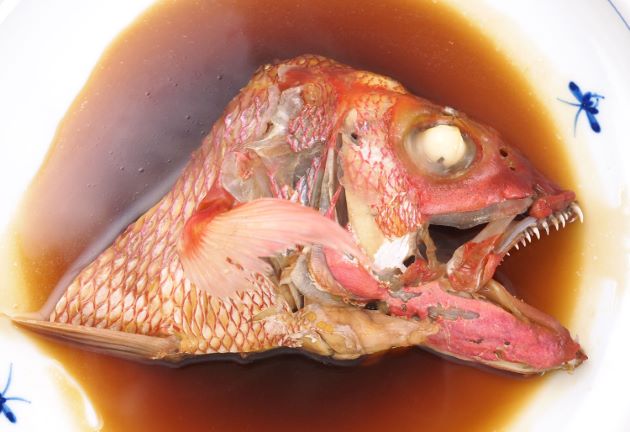 ハチジョウアカムツの煮つけ ここでは頭部を煮つけにしたが、あらなどでもいい。水洗いして頭部を梨子割りにする。湯通しして冷水に落とし、残った鱗やぬめりを流す。水分をよくきり、酒・砂糖・醤油・水を合わせて煮立てたなかで煮る。皮周辺、身離れのいい身自体にも味があり、うま味が出た煮汁もおいしい。