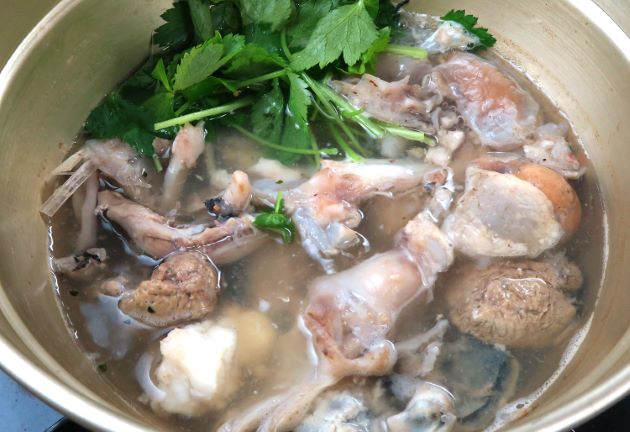 ハナグロフサアンコウの鍋 硬い皮を剥き、水洗いする。内臓をていねいにわけて水分をよくきる。すべて湯通しして冷水に落とし、水分をよくきる。これを昆布だし・酒・塩を煮立てた中で煮ながら食べる。だしを使って酒・塩で味つけしたなかで煮てもいい。また韓国式に唐辛子を振ってもおいしい。内臓それぞれの味わいが楽しめる。