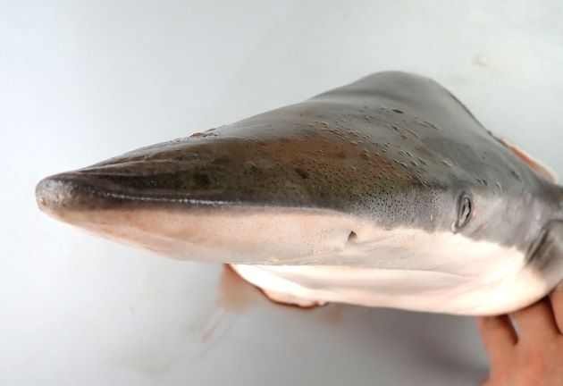 最大3m TL 前後になる。吻端は尖る。目に欠刻がなく瞬膜がある。胸鰭・第2背鰭・尻鰭・尾鰭下葉の先端が黒い。第1背鰭の起部は胸鰭後端のやや後ろ。第1背鰭と第2背鰭の間の長さは第一背鰭の高さの2.2倍以上(写真は2.8倍)。[高知県幡多郡大月町古満目 91cm TL・4.088kg 第二背鰭・胸鰭・臀鰭・尾鰭下葉の先端に黒斑があるが、腹鰭には黒斑がない]