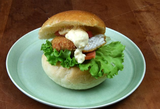 ハナザメのフライ(ハンバーガー) 切り身にして塩コショウする。小麦粉をまぶし、衣(卵・小麦粉・水)をつけてパン粉をつけて揚げる。表面はさくっと揚がり、身は柔らかくジューシー。万人向きの味わいで弁当のおかずにもなる。バンズで挟むとおいしいハンバーガーになる。クリックで閉じます![]()
