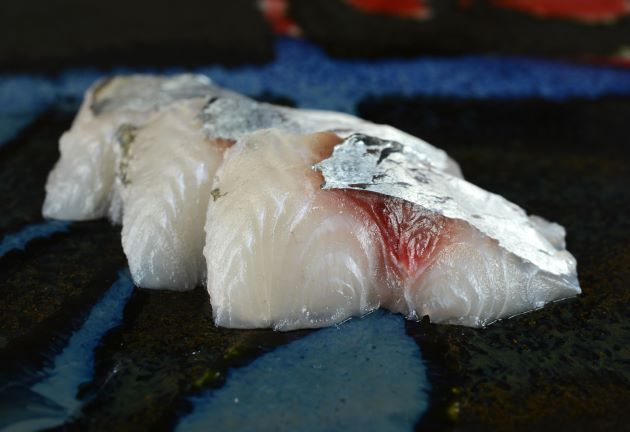 ハマダツの刺身 三枚に下ろして血合い骨を抜く。これを刺身にしたもの。銀皮があり、血合いが強いものの、うま味が強く捨てがたい味わい。柑橘類と相性がいい。わさび、しょうがなどはお好みで。