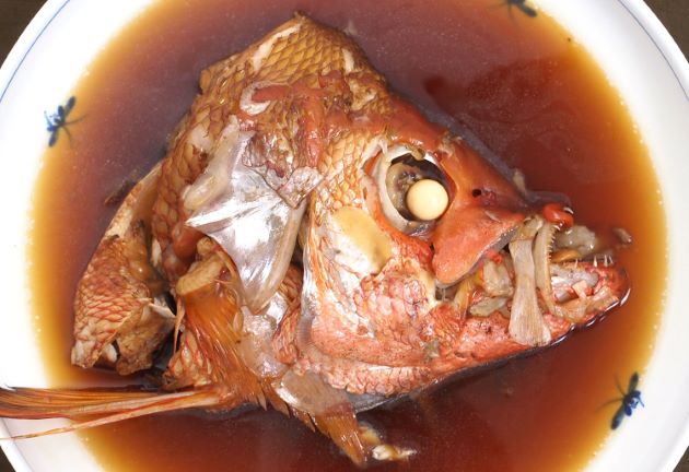バケアカムツの煮つけ 切り身でもあらでもどこでもいい。水洗いしてここでは頭部を梨子割りにした。湯通しして残ったぬめりや鱗を流し、酒・砂糖・醤油・水で煮る。酒・醤油・水であっさり煮てもいい。皮目がゼラチン質で甘く、身に豊かなうまみがある。ほどよく繊維質で身離れがよく実に美味。クリックで閉じます![]()