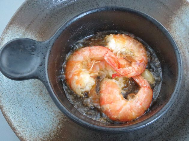 バナメイのアヒージョ アヒージョはスペイン料理で無頭をにんにくオイルで煮たもの。アヒージョ皿にオリーブオイル、くだいたにんにくを入れて加熱、香り立ってきたらエビを入れて火を通す。エビの香りが強くでてワインにあう。クリックで閉じます![]()