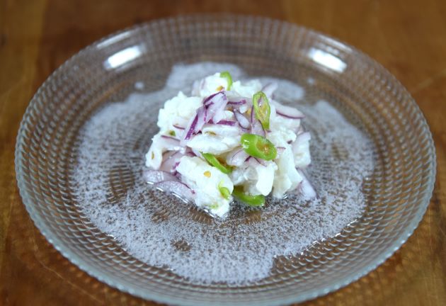 ヒキマユメイチのセビチェ 刺身を作るとどうしても上身が余る。これを余すところなく使うにはセビチェがいい。細かく切り、塩・ライム・辛い唐辛子・赤玉ねぎで和える。30分ほど寝かせると、切り身の表面が真っ白になる。スピリッツのつまみに少しずつつまむと実に小粋な味。クリックで閉じます![]()