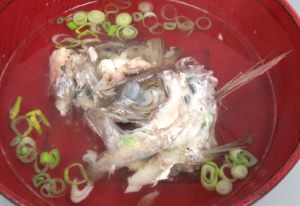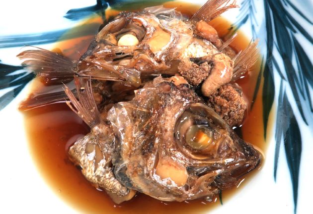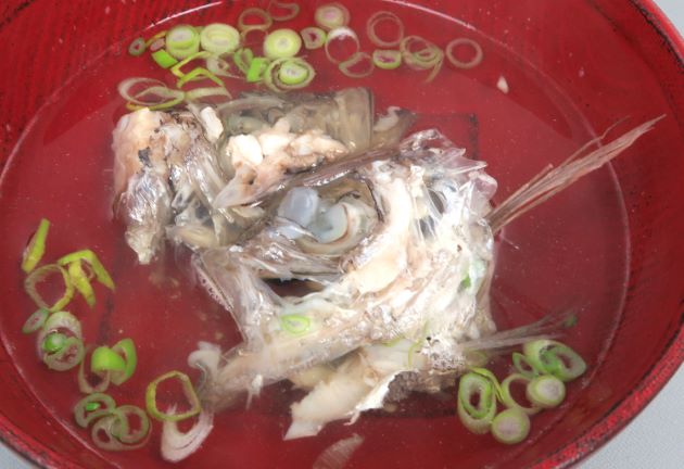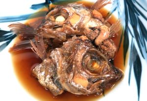 ヒゲオオメハタの煮つけ 刺身などにして残ったあらや、卵巣、などを集めて置く。頭部などは梨子割りにして、あらと一緒に湯通し、冷水に落として残った鱗やぬめりを流す。水分をよくきり、酒・醤油・砂糖・水を煮立たせた中で煮る。実にいいだしが出て、その煮汁をからめながら食べると無類の味。卵巣もおいしい。クリックで閉じます![]()