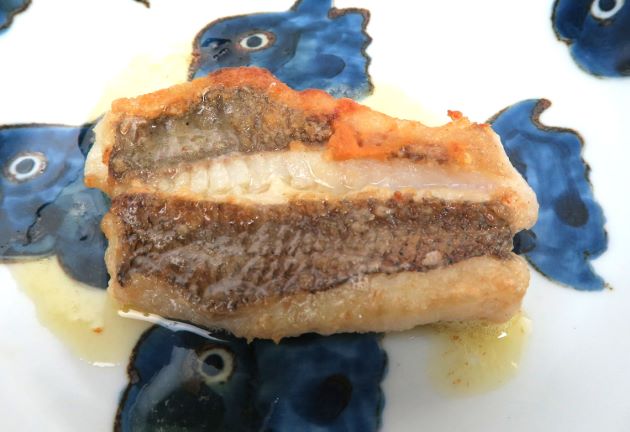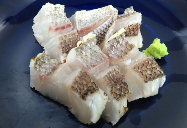 ヒゲオオメハタの焼霜造り やや水分が多いものの、身にも皮目にも豊かな味がある。これはオオメハタ属の魚の特徴である。ここでは熱を通すと独特の風味が出る皮を生かして料理してみた。クリックで閉じます![]()