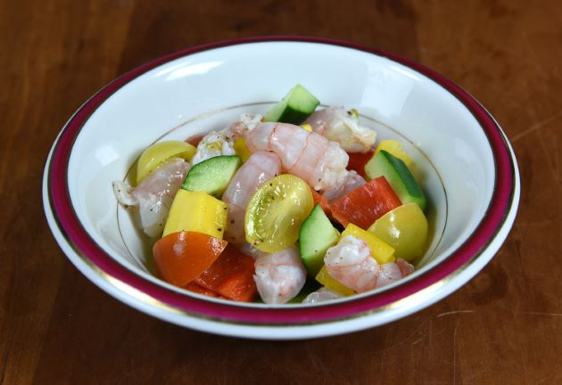 ヒゲナガエビのマリネサラダ ヒゲナガエビは剥き、塩とライム(ワインビネガーでも)でマリネする。そこに好みの野菜を加えたもの。カイエンヌペッパーを振るか、辛い唐辛子をマリネするときに加えてもいい。クリックで閉じます![]()