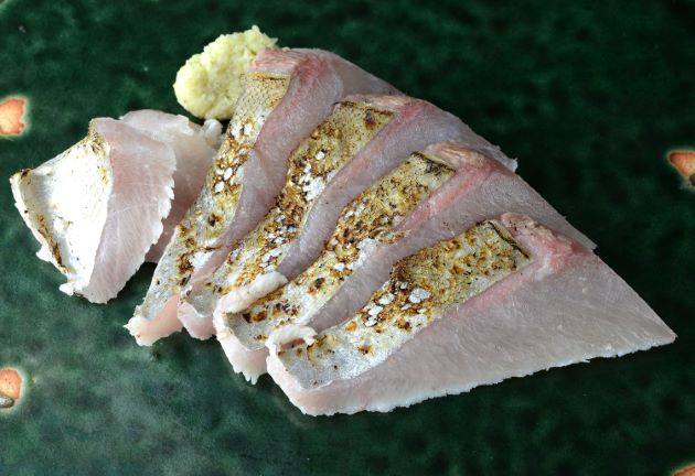 ヒシカイワリの焼霜造り(焼き切り) 腹の部分は非常に脂が強く、しかも身がしまっている。背よりも皮が薄いのでこの皮を生かしてみた。皮目の香ばしさがいい。しまった身も噛めば噛むほど味がある。クリックで閉じます![]()