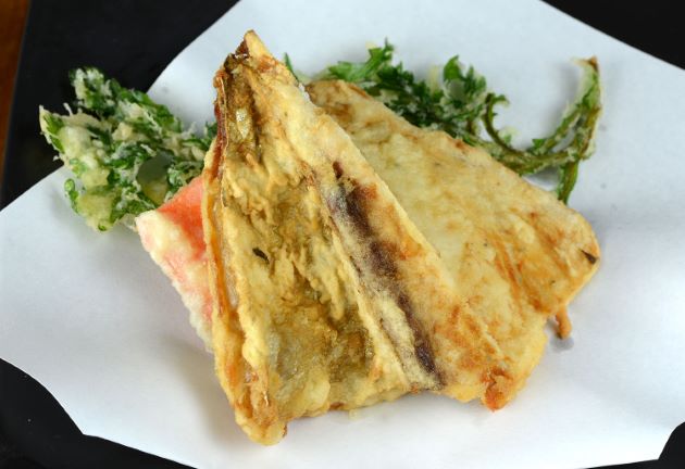 ヒシカイワリの天ぷら 成魚の尾鰭近くの筋の多い部分を揚げたものである。非常に脂が乗っているので、表面はさくっと香ばしいが、中はとろっとして豊潤である。この表面と中の差が楽しい。クリックで閉じます![]()