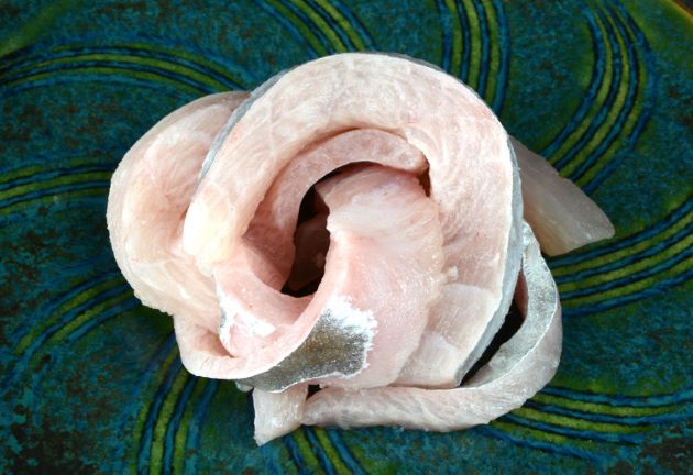 水洗いして三枚に下ろす。皮を引いて刺身状に切る。写真は背の部分である。