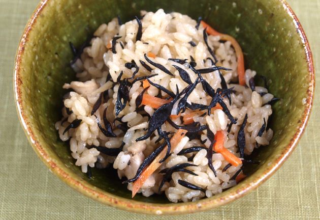 ヒジキの炊き込みご飯 乾燥ヒジキは水でもどし、軽く水洗いしておく。普通に水加減した炊飯器にヒジキ、ゴボウ、ニンジン、油揚げなどを入れ、酒、しょうゆで味つけして炊飯したもの。ヒジキの定番的料理でたいへんおいしいものである。クリックで閉じます![]()