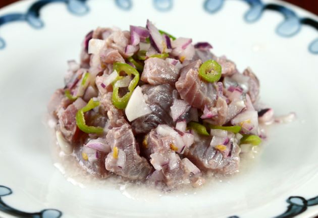 ヒラソウダのセビチェ 水洗いして皮を剥く。三枚に下ろして血合い骨・腹骨を取り細かく切る。これを塩・ライムジュース・辛い唐辛子・紫玉ねぎ(普通の玉ねぎでも)で和えて寝かせる。塩辛くで酸っぱくて、ぴりりと辛い爽やかな味わい。パンなどに乗せて食べてもいいし、豆やジャガイモなどと食べてもおいしい。クリックで閉じます![]()