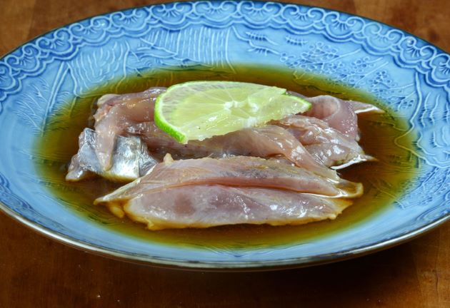 ヒラソウダ若魚の刺身(土佐新子風) 高知県の西部ではマルソウダの若魚(新子)を刺身にして仏手柑(青い柑橘類で独特の香りがある)の汁と果皮を下ろしてのせて醤油をかけて食べる。これをライムと醤油でやったもの。血合いはていねいに取ってある。クリックで閉じます![]()