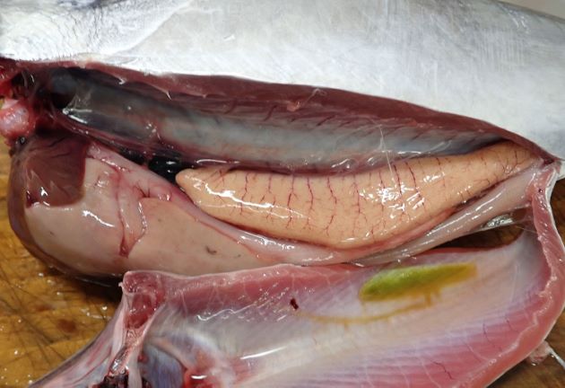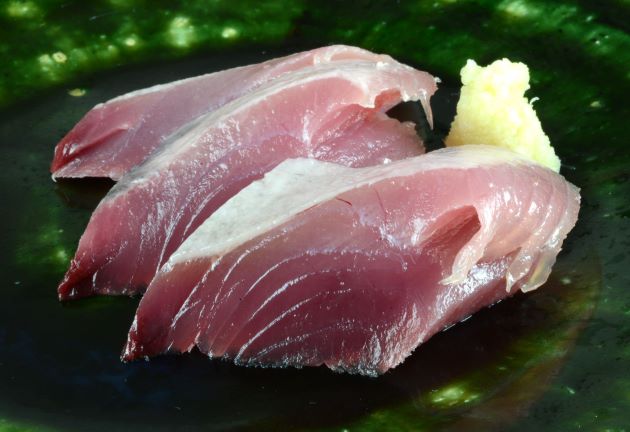 水洗いして三枚に下ろす。背と腹にわけて背の部分だけを刺身にする。脂は皮下に白く層を作り、身にも網目状に刺し込んでいる。厚めに切るとぼってりした食感ながら、舌に口溶け感を強く感じられる。非常にうまい。