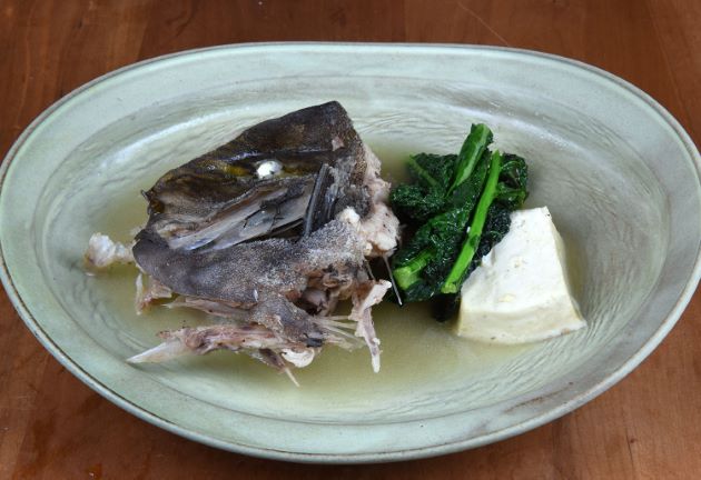 ヒラニザのまーす煮 強めの塩水で短時間で煮上げるもの。ここでは兜の部分を使う。梨子割りした頭部を強めの塩水で煮上げる。「まーす煮」本来は液体を飛ばしきる料理法だが、適度に残して仕上げる。身をほぐしながら煮汁と一緒に食べる。豆腐を一緒に煮るとこれがまた非常にうまい。クリックで閉じます![]()