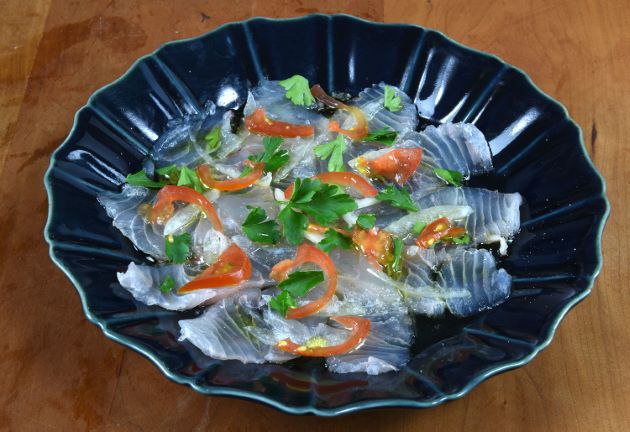 ヒラニザのカルパッチョ 身は非常に緻密で、血合いがよわく、白身として実にきれい。これをできるだけ薄く切る。皿ににんにくをなすりつけ、オリーブオイル、塩を入れて、切身を並べていく。上からも塩とオリーブオイル、コショウなどを振り、馴染ませて好みの野菜を散らす。味わいが多彩であるのに、後口が軽い。白ワインに非常に合う。クリックで閉じます![]()
