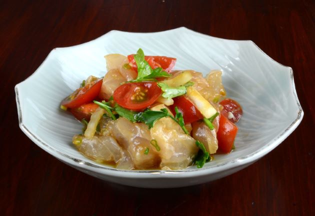 ヒラニザのポケ(ポキ) 刺身などにするとどうしても端切れや尾に近い部分などが出る。これを集めて置く。トマトやアボカド、ルッコラなどの野菜を適当に切り、合わせて好みの味つけをする。ここではしょうゆ・ごま油、スイートチリソースを使ったが、しょうゆではなく塩でもいい。また柑橘類を使ってもおいしい。クリックで閉じます![]()
