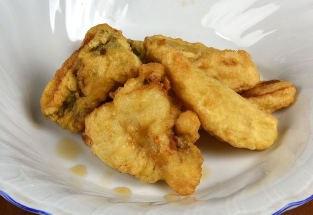 ヒラニザのポテト&チップス 切身に衣をつけて、ポテトと一緒に揚げたもの。衣は小麦粉・卵・酢・少量のオイルもしくはマヨネーズ・ビール。さくっと軽く揚がり、中がふんわりして甘味がある。柑橘類や酢を振るといい。クリックで閉じます![]()