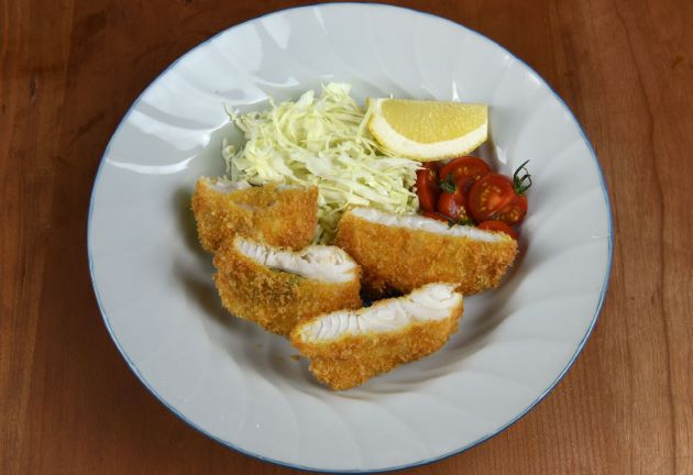 ヒラニザのフライ 大型なのにフライ用の切身になる。これに塩コショウして、小麦粉をまぶし、バッター液(卵・小麦粉・水)もしくは溶き卵をからめて、パン粉をつけて揚げる。揚げても身は硬く締まらず、筋肉の層に肉汁が感じられてとてもおいしい。クリックで閉じます![]()