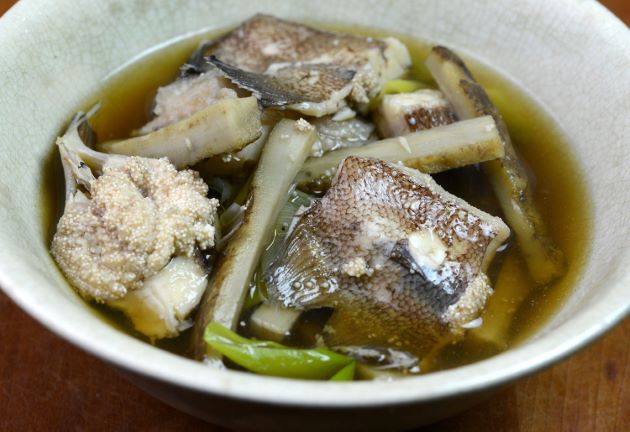 山がれいのじゃう(鍋もの) 兵庫県日本海側但馬地方の郷土料理「じゃう」は魚の醤油味の煮物、汁もの、鍋もののことだ。水揚げされた魚の中でも比較的値のつかない魚を使うが、今、もっともよく使う魚が小型の「山がれい(ヒレグロ)」である。醤油味で煮込むということ以外あまり決まり事がなく、ここでは香住の共進丸で聞き取ったことを基本とした。
