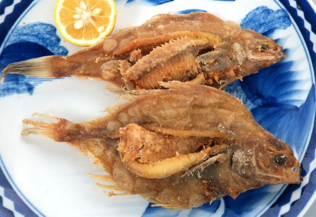 干ものの唐揚げ 干ものに適宜に切れ目を入れて、片栗粉をまぶして揚げたもの。水分が多く、骨が軟らかい分だけ唐揚げに向いている。カレー粉を使ったり、コショウをきかせるとなおおいしい。