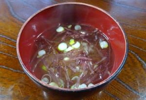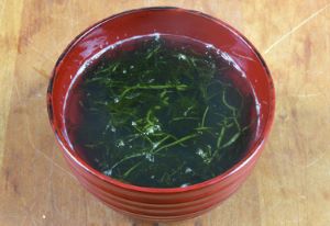 フクロフノリのみそ汁 乾物はみそ汁が出来た状態、火から下ろした状態で加える。生のものは火を止める直前に入れる。乾物の方が香りが高い。磯の香りに、シャキシャキした歯触り、海藻のおいしさが楽しめる。