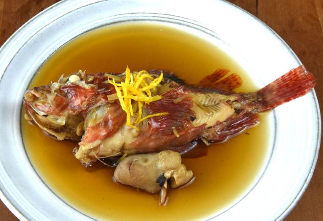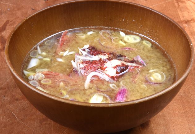 フサカサゴのみそ汁 あらを集めて置く、肝や胃袋などもあれば一緒に湯通しする。冷水に落として残った鱗やぬめりを流す。水分をていねいにきり、水から煮出してみそを溶く。実に味わい深い汁になり、あらや肝もすこぶるつきにうまい。クリックで閉じます![]()