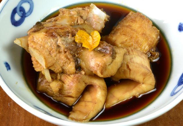 湯通しして表面のタンパク質をかためて冷水に落とす。水分をよくきり、酒・みりん・醤油・しょうがの薄切りで煮上げる。