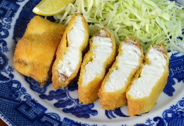 フトツノザメのフライ 非常に上質の白身で熱を通しても臭味が出ない。ただ味は無個性で淡泊だ。このような魚は油を使った料理に向いている。湯通しして冷水にとり、鱗と皮をこそげ落とす。これを切り身にする。塩コショウし、小麦粉をまぶし、溶き卵をくぐらせ、パン粉をつけて揚げる。表面はパン粉で香ばしく、中は豊潤である。白身のフライとしては上々である。クリックで閉じます![]()